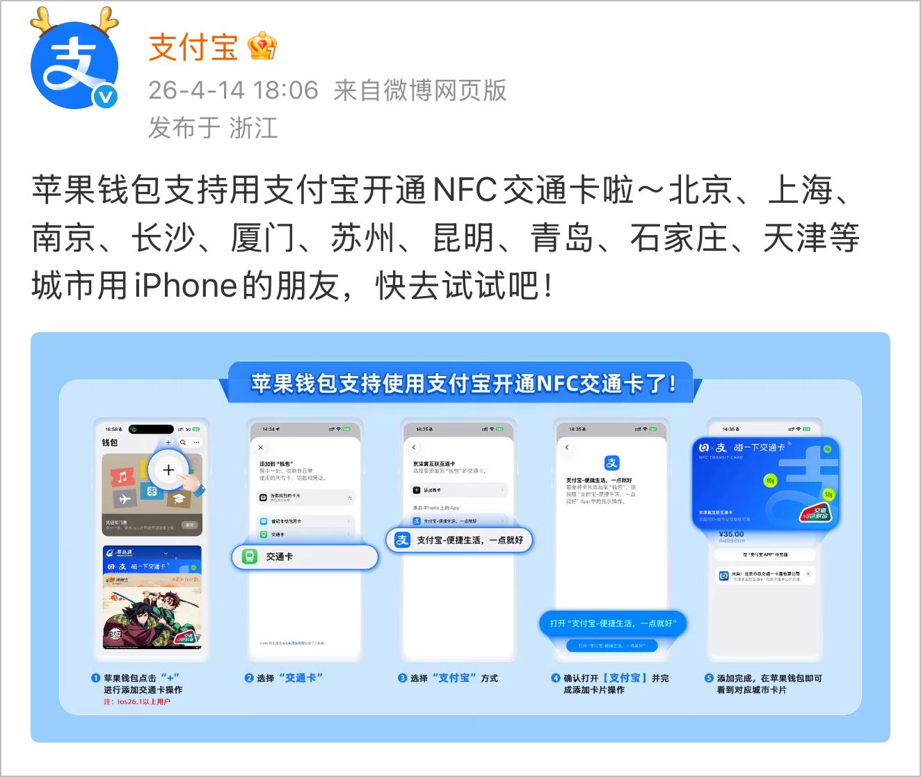 支付宝最近宣布:苹果钱包支持用支付宝开通 NFC 交通卡了!