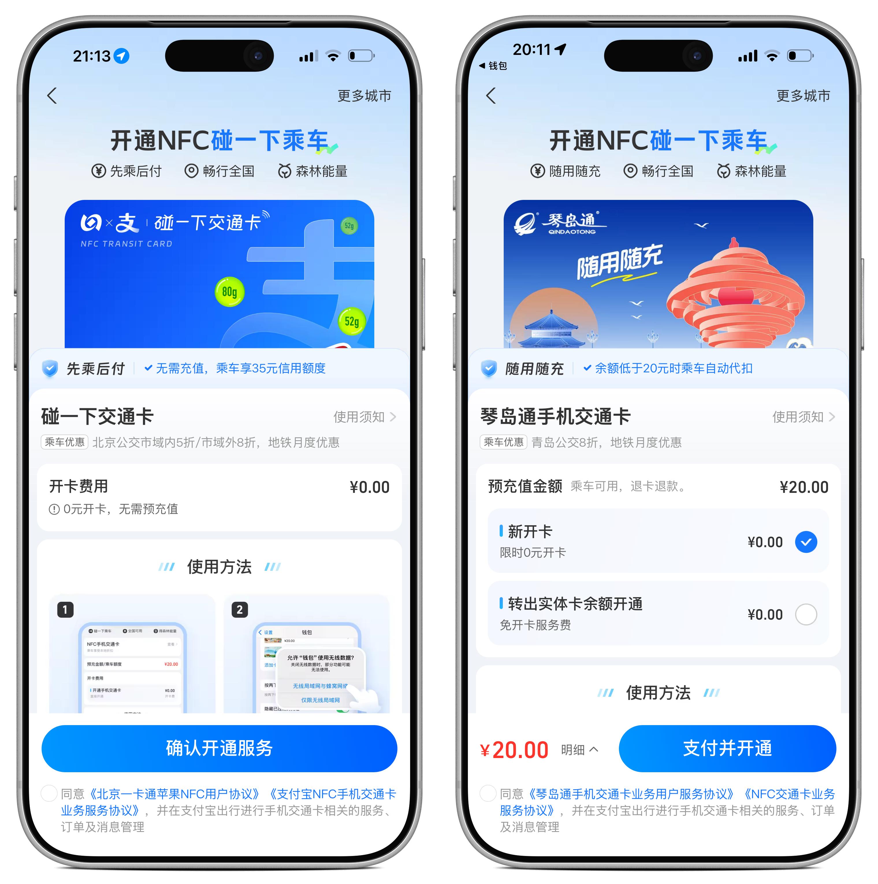 比如北京的卡可以 0 元开卡,无需充值就能使用 35 元额度的「先乘后付」服务;而青岛的卡如果是新开,则需要预充值,并提供「随用随充」服务。