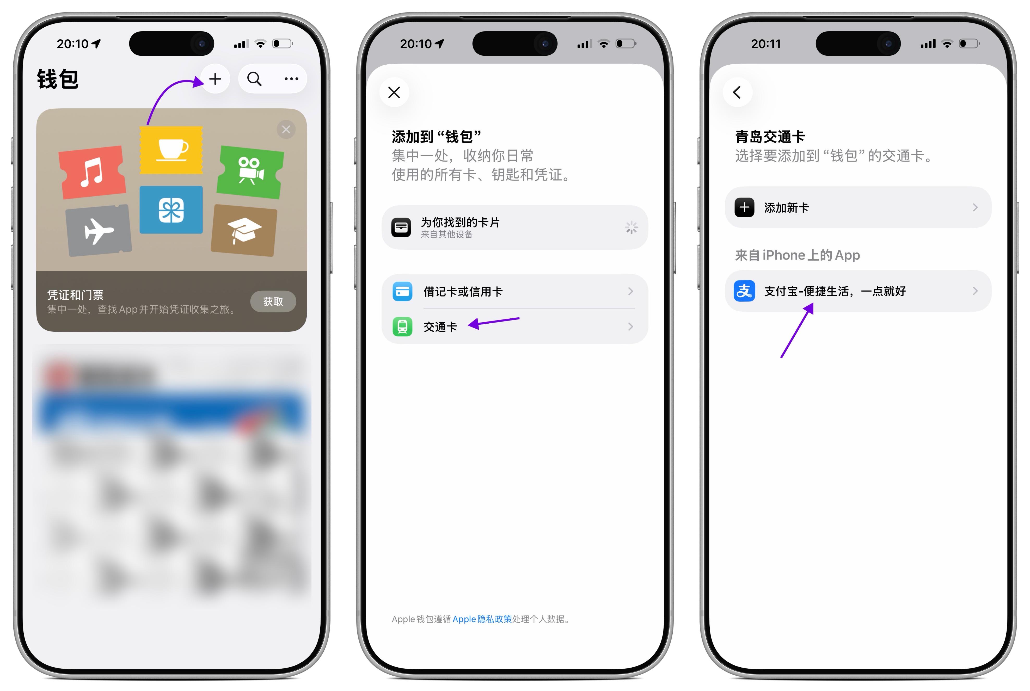 在 iPhone「钱包」应用顶部点击「+」,添加「交通卡」,选择你所在城市的交通卡。如果支付宝已经支持该城市,就会看到新增的「支付宝」选项。