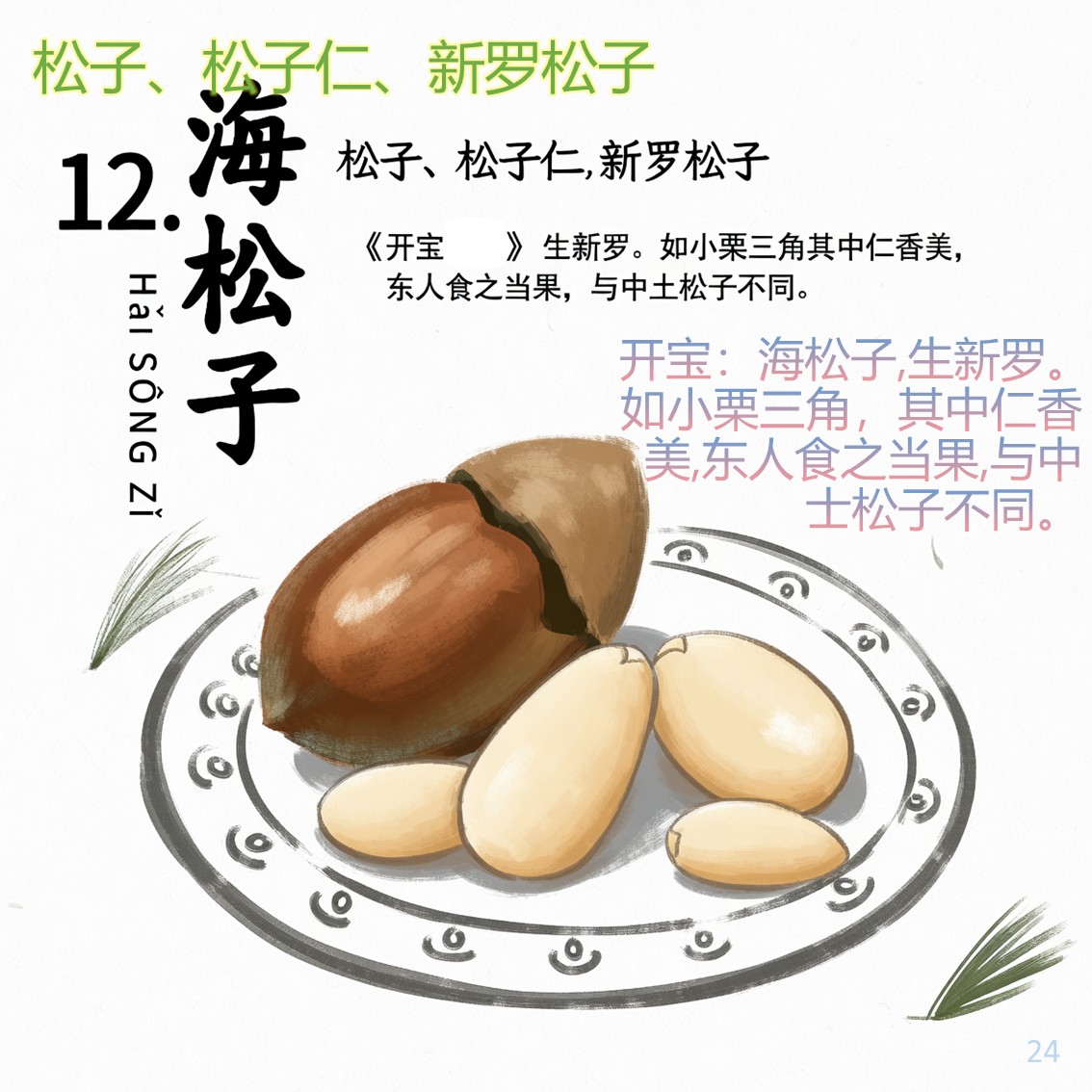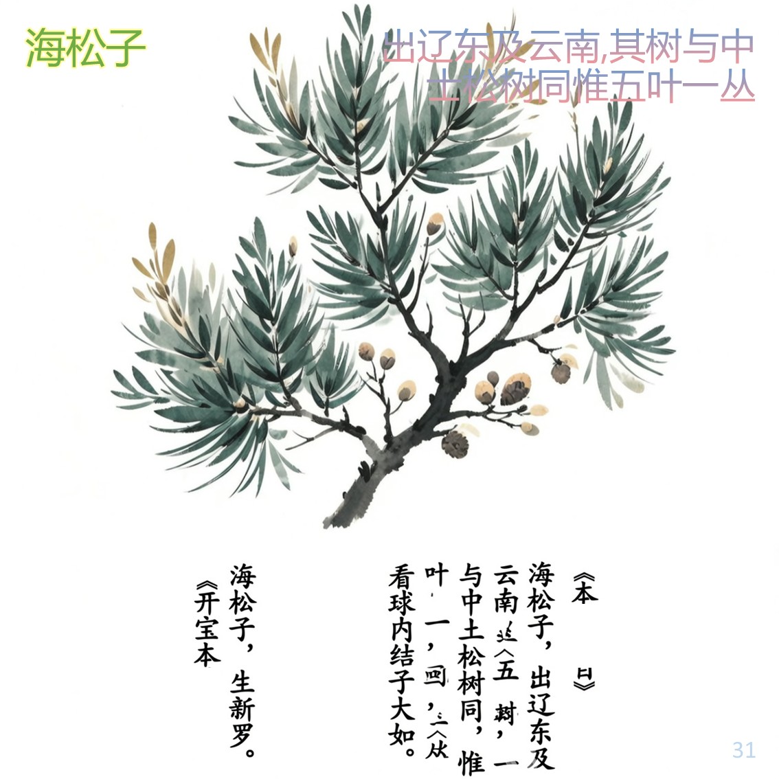 开宝:海松子,生新罗。如小栗三角,其中仁香美,东人食之当果,与中士松子不同。