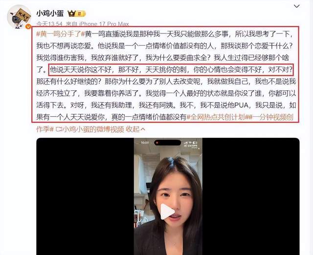 “天天说你这不好那不好,你的心情也会变得不好,那还有什么好继续的?”黄一鸣在直播里这样解释。她觉得,如果一段感情让人不断怀疑自己,那还不如一个人过。