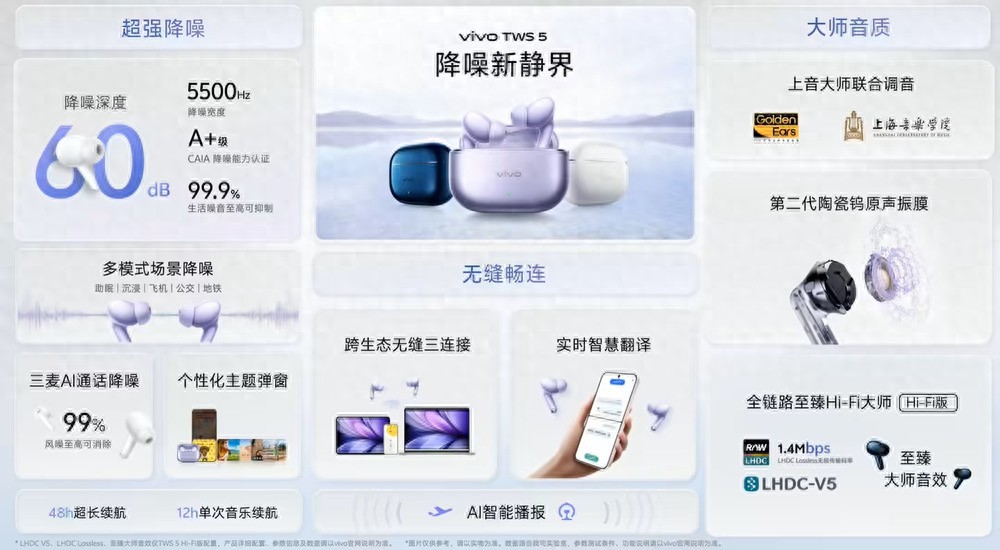 新品支持跨生态无缝三连接,安卓苹果全能连;vivo 金耳朵声乐团队与上海音乐学院联合调音,获得 Hi-Res 高品质无线音频认证;全新配色「微薰紫」,实时智慧翻译,个性化智慧弹窗,48 小时长续航,42ms 超低游戏延迟等全新升级功能。
