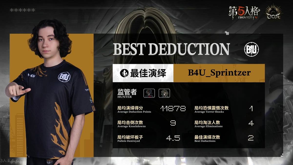 BO1上半局,B4U_Sprintzer选用歌剧演员,前期歌剧演员稳定淘汰木偶师,并在两次守椅战中均打出双倒局面。中期歌剧演员将魔术师击倒送椅,不久后传送击倒野人并将其送椅,幸运儿先后救下魔术师和野人。后期歌剧演员经过数次换追换挂,成功淘汰剩余求生者,完成四抓。