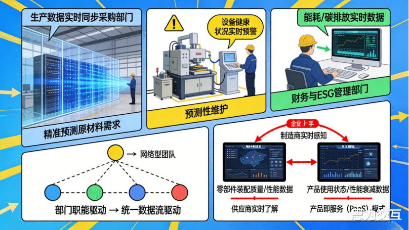 在组织内部,部门墙被数据流穿透。生产数据实时同步给采购部门,以精准预测原材料需求;设备健康状况实时预警给维护部门,变计划性维护为预测性维护;甚至能耗、碳排放的实时数据直接对接给财务与ESG管理部门。企业的运营从“部门职能驱动”转向“统一数据流驱动”,组织架构也需要向更敏捷、更融合的网络型团队演进。