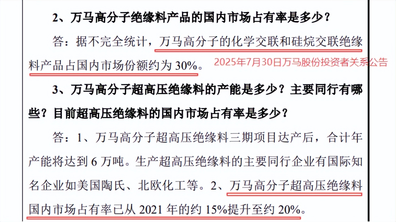 现在的万马股份,高分子材料一年卖出近60万吨,在超高压绝缘料这一细分领域的市占率接近20%;在高分子的化学交联和硅烷交联绝缘料领域的市场份额更是达到30%,稳居行业第一!