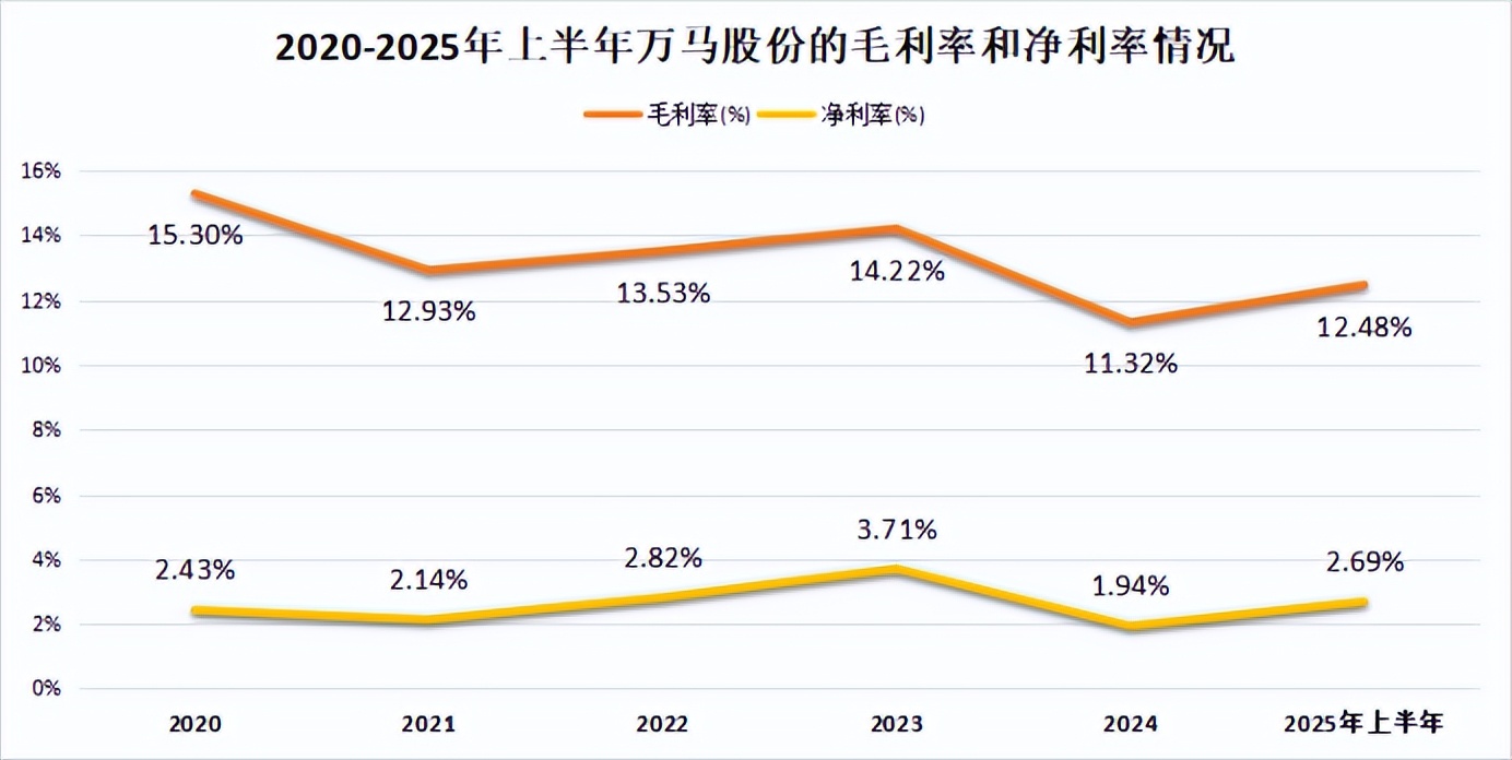 2025年上半年,毛利率的增长拉动万马股份的净利率比2024年同期增长了0.27个百分点,达到2.69%。