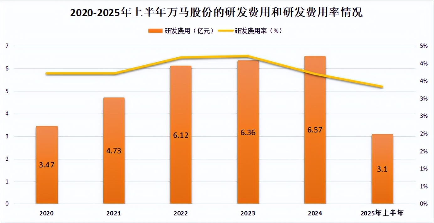 到了2025年上半年,万马股份的研发费用也有3.1亿元,研发费用率达到3.34%,比东方电缆、起帆电缆等同行都要高。