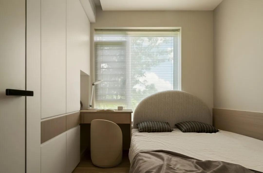 立柜收藏了琐碎,书桌承载着篇章,小床安放了酣眠,它们高低错落,藏敞有致,以有序的默契,勾勒出栖居的轮廓。木纹放大了温润之美,舒缓着久视目光,曲面演绎优雅气质,将人拥入其中。