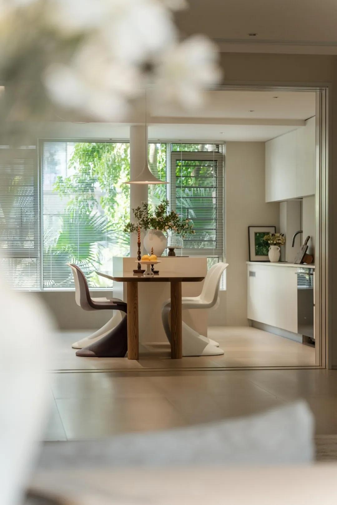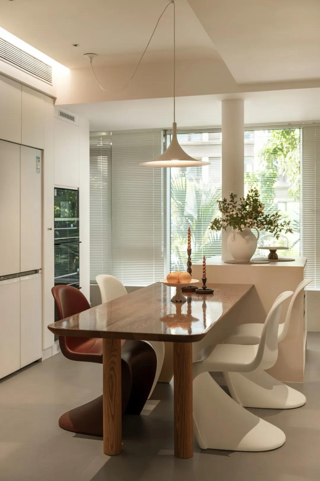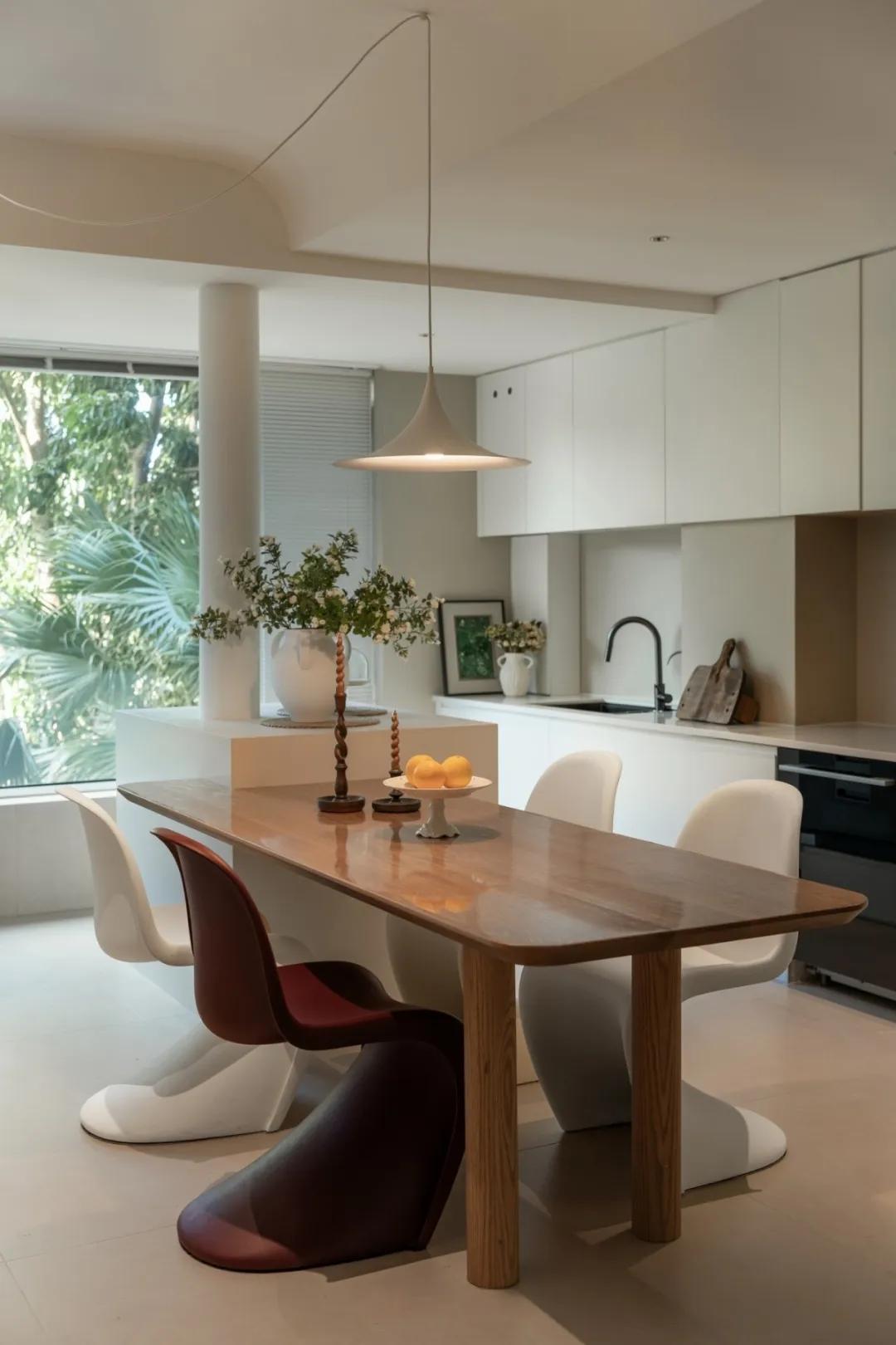 整合空间,完成餐厨一体化的构想,让烹饪的温度与举杯的欢笑,在同一片时光里交融。实木餐桌穿插于白色岛台,与“不完美”的落水管相连,指引着餐厨的流线轨迹。四周是温馨的烟火味道,抬眼便能看到花园里的美好。