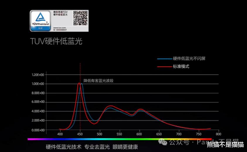 除了对比度和色深的优势,他在护眼方面也做到了软硬件的双重低蓝光,能有效过滤415~455nm的有害蓝光,提供更为舒适的感官体验。