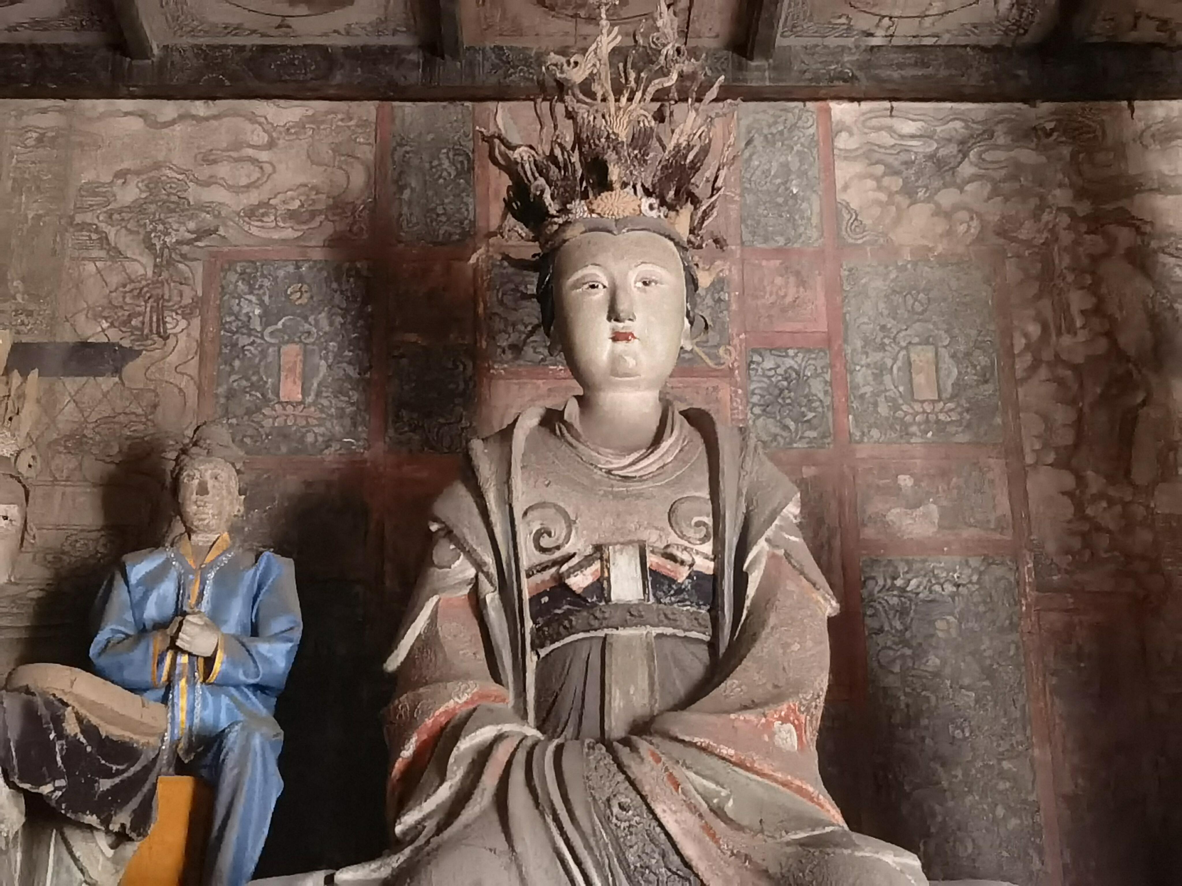 殿内的神坛与两山墙下,35尊彩塑井然排列,如同一场永不落幕的人间盛会。主位之上,后土娘娘真身端坐,不同于传统神像的庄严肃穆,她的面容更似邻家妇人般温婉亲和。眉梢眼角的弧度,似带着洞悉世事的温柔笑意,衣袂褶皱自然垂落,仿佛下一秒就会抬手抚平信众眉间的忧愁。环绕在真身四周的五个化身,姿态各异却又神态相连,有的手持书卷若有所思,有的轻抚法器凝神静气,将后土娘娘掌管大地、护佑苍生的神职,化作具象的人间百态。