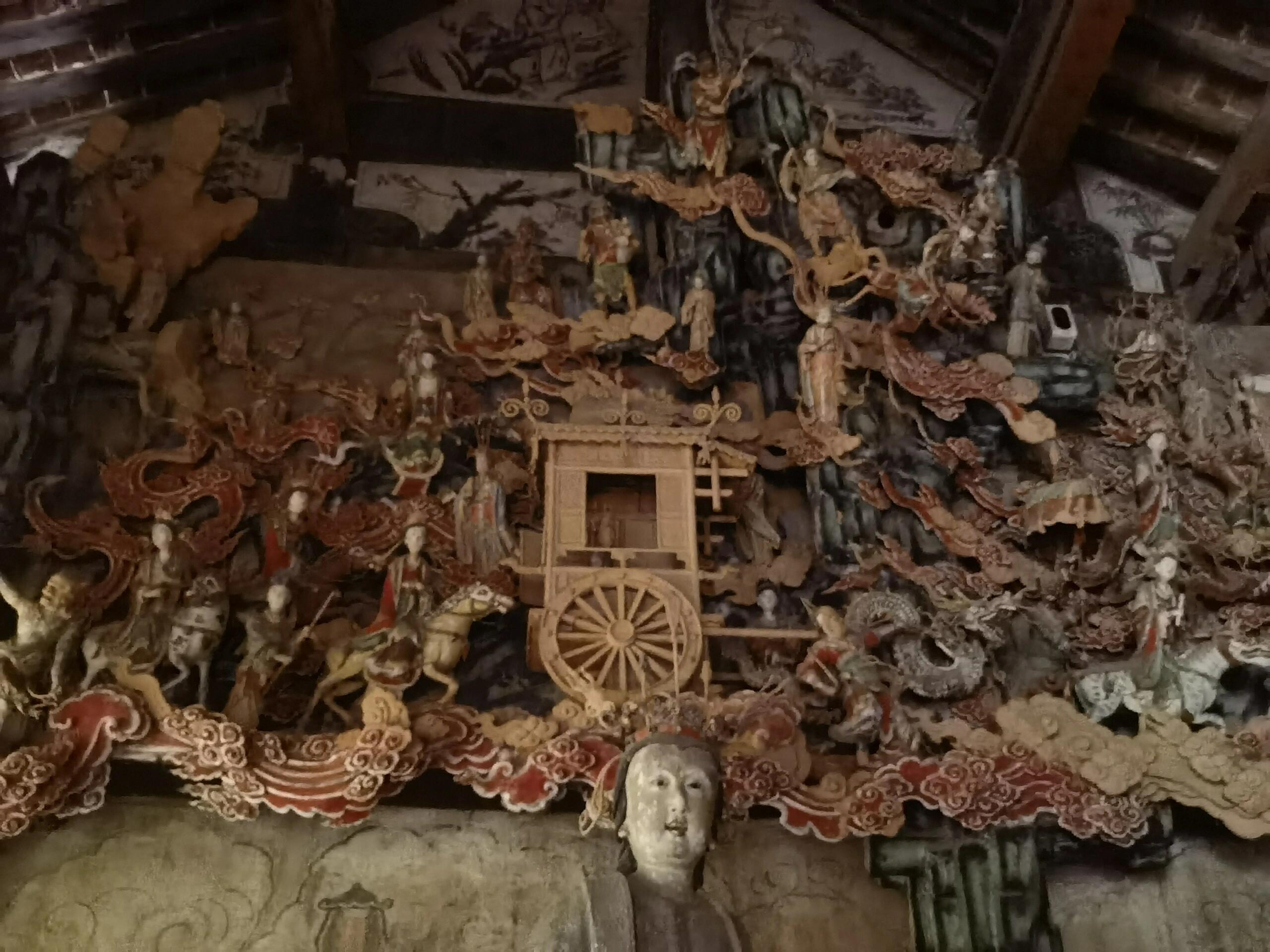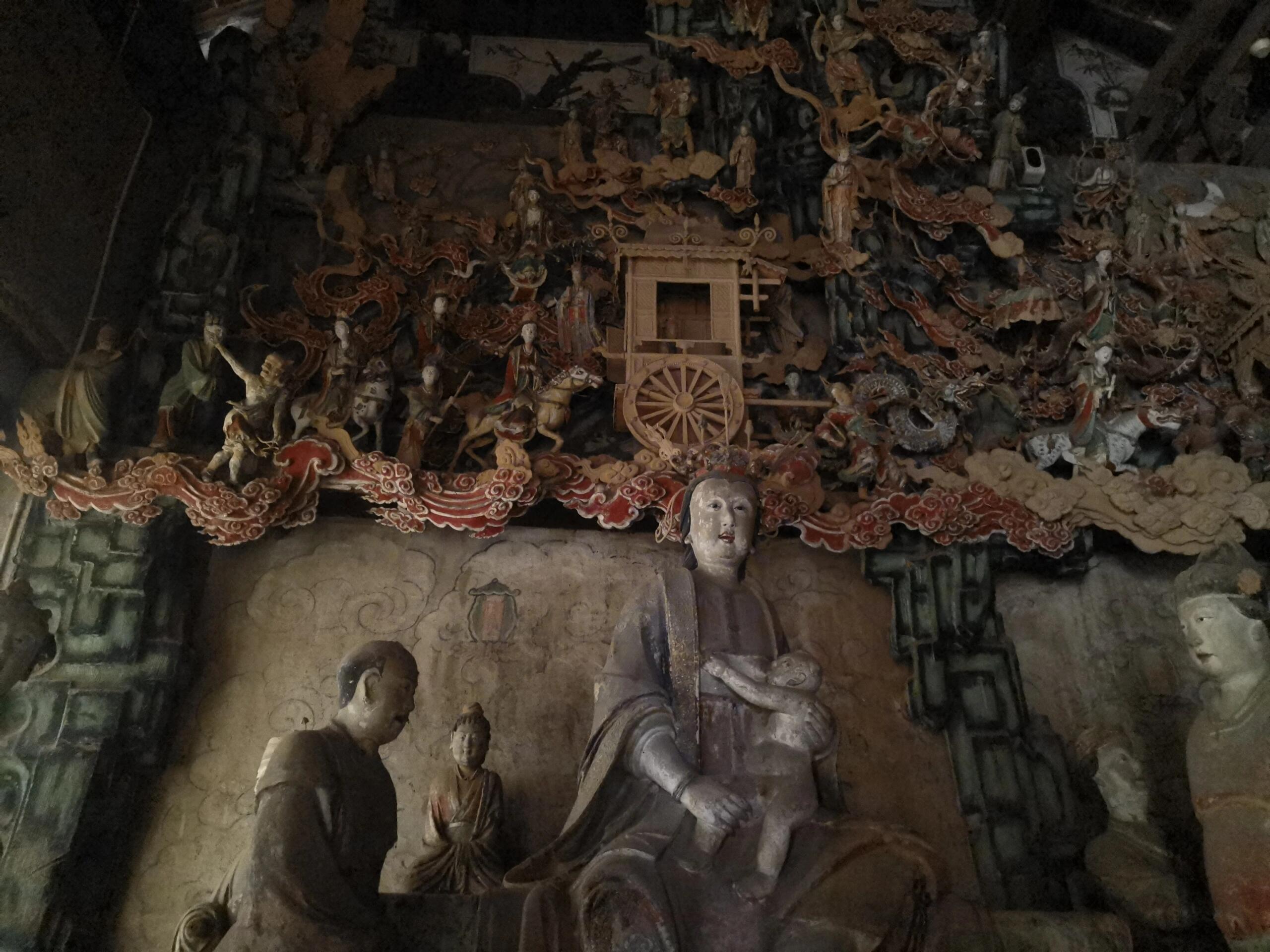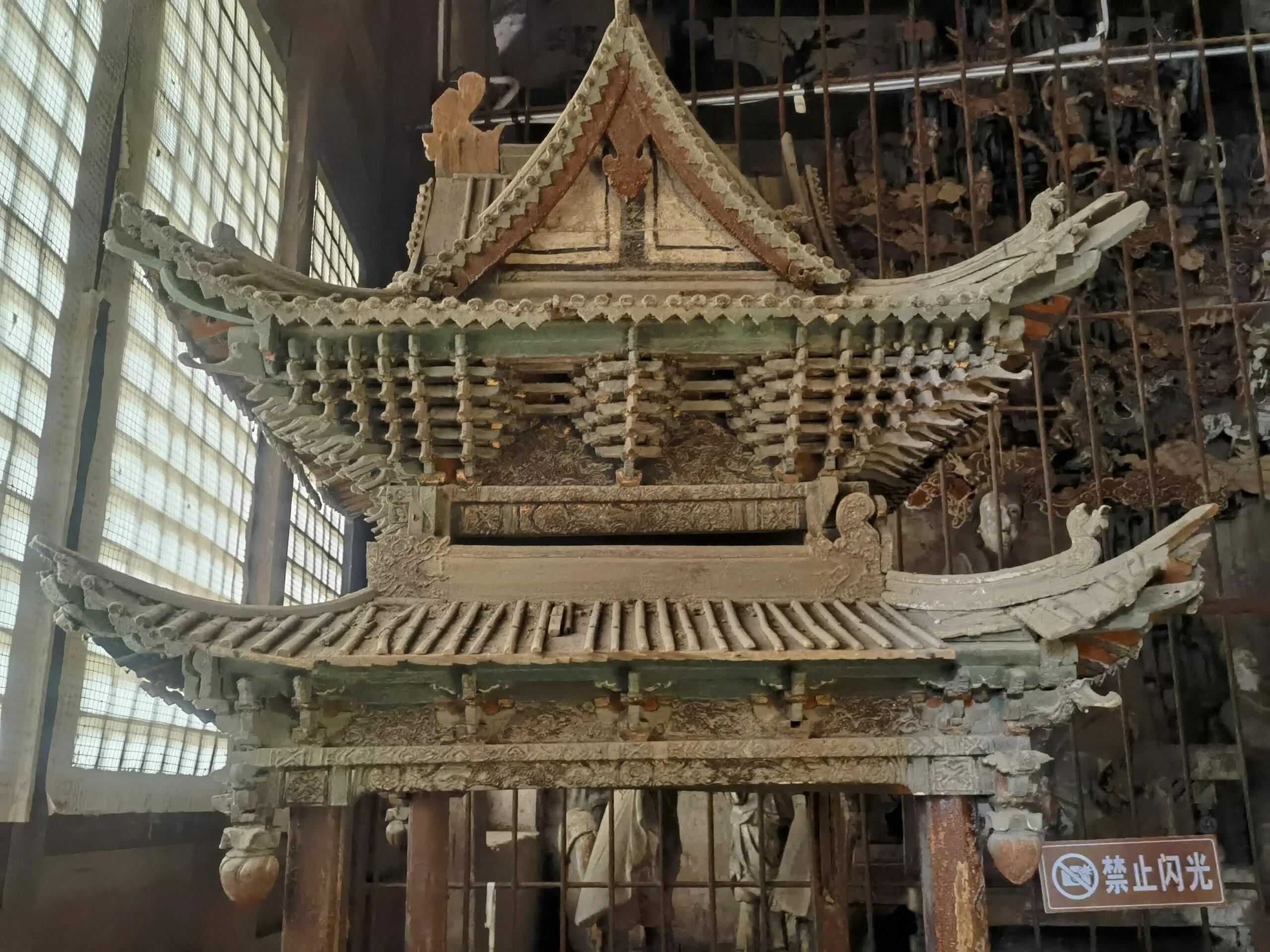 站在殿内环顾四周,彩塑与悬塑的鲜活、木构神轿的精巧,共同编织出独特的空间叙事。阳光透过窗棂洒落,在彩塑表面投下明暗交错的光影,那些神像仿佛被赋予了生命,开始诉说着千百年来的故事。在这里,神仙不再是遥不可及的存在,而是融入百姓生活的守护者;建筑也不只是遮风避雨的场所,而是承载信仰与审美的艺术载体。