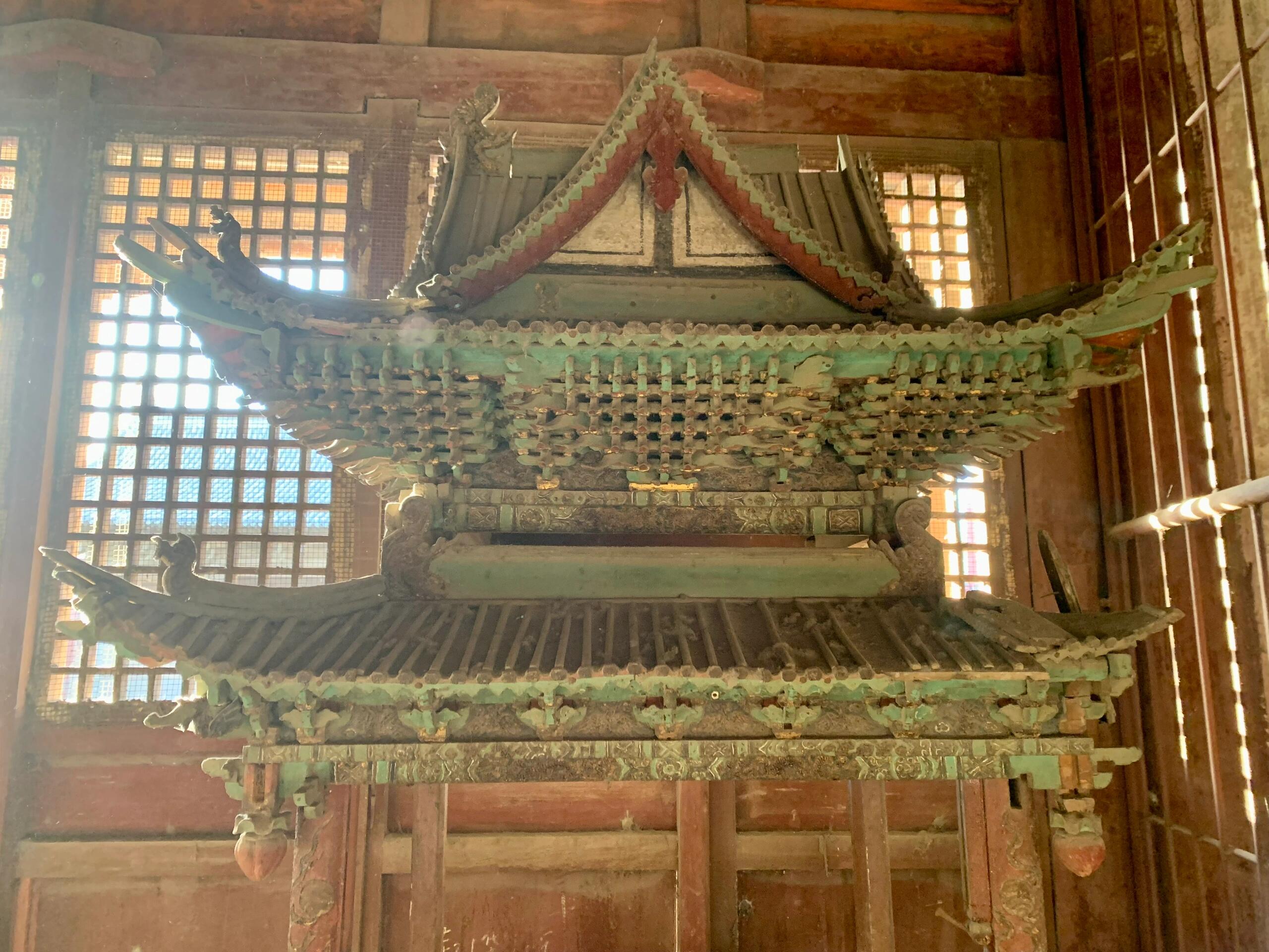 角落里的五顶“神轿”,是民间信仰与精湛工艺碰撞的结晶。这些曾承载着百姓祈愿的交通工具,虽历经岁月侵蚀,仍难掩昔日风华。重檐十字歇山顶的设计,既有皇家建筑的庄重,又不失民间艺术的精巧。上层檐的斗拱如同细密的蜂巢,层层叠叠向上延伸;下层檐转角处的垂柱,雕刻着莲花卷草纹样,恰似从云端垂下的琼枝。墨色山花绘于梁柱之间,粗犷的笔触与细腻的沥粉金龙形成鲜明对比——金龙缠绕在四根立柱之上,龙须飞扬,鳞片可数,虽无斑斓色彩,却以凸起的纹理与金属光泽,彰显着不可侵犯的威严。每顶神轿的轿身装饰都各有巧思,有的镶嵌着微型门窗,有的雕刻着吉祥纹样,即便破损处露出木质肌理,反而更添几分古朴沧桑。