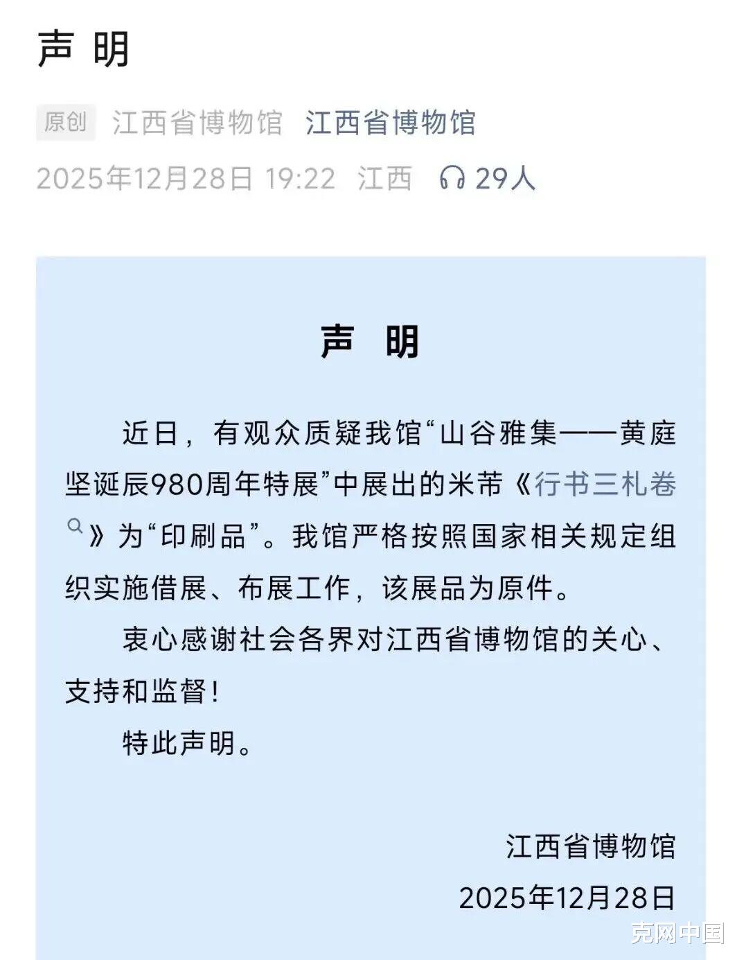 紧接着,一位拥有近 30 万粉丝的书法博主站出来,直指江西省博物馆展出的《米芾三札》“像印刷品”。
