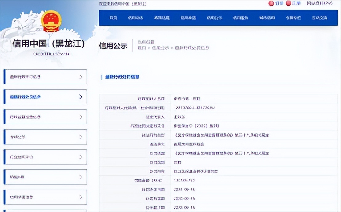 根据“信用中国”网站年前公开消息,伊春市第一医院因违规使用医保基金,被处以医保基金损失2倍罚款,罚款金额为1301万元。