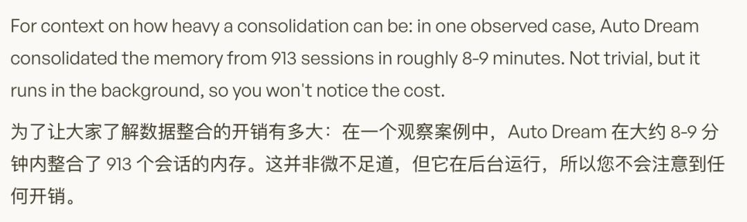 社区之前提过一个夸张的案例,913个对话积累的记忆,Auto Dream大概花了8到9分钟整理。