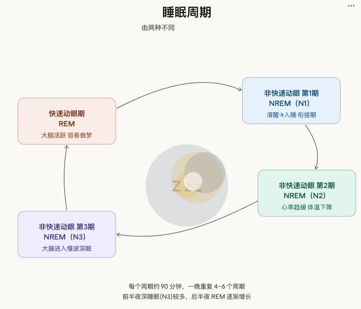 到了晚上你进入睡眠,大脑会经历好几个周期的非快速眼动睡眠和快速动眼睡眠交替。
