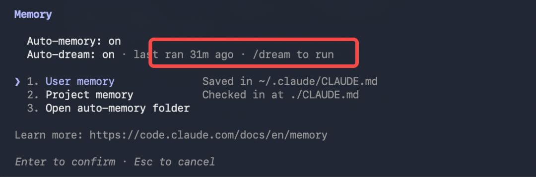 大家也可以试试,在Claude Code里输入/memory,看看有没有auto-dream这个选项,如果有的话就可以打开。