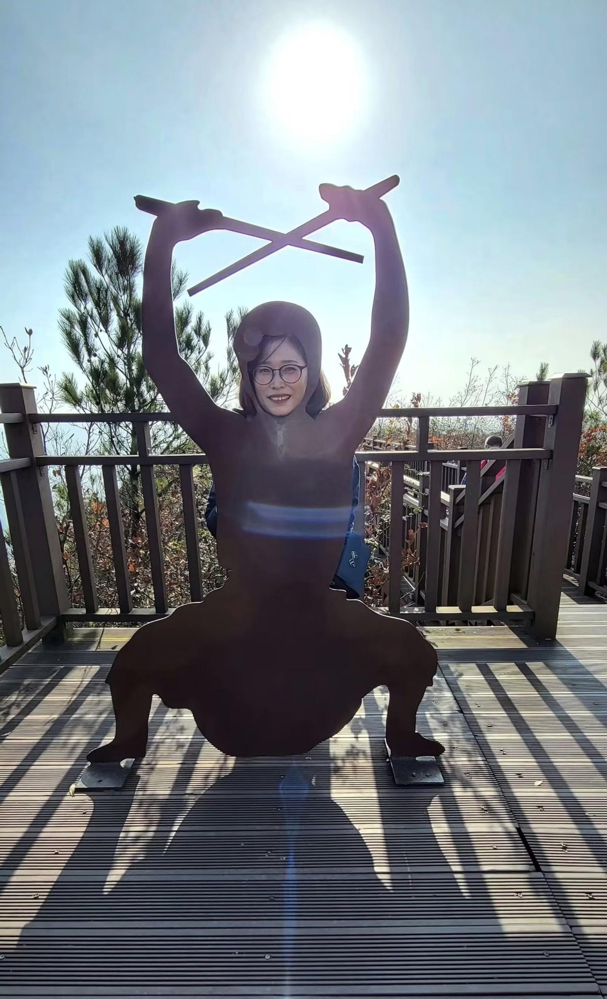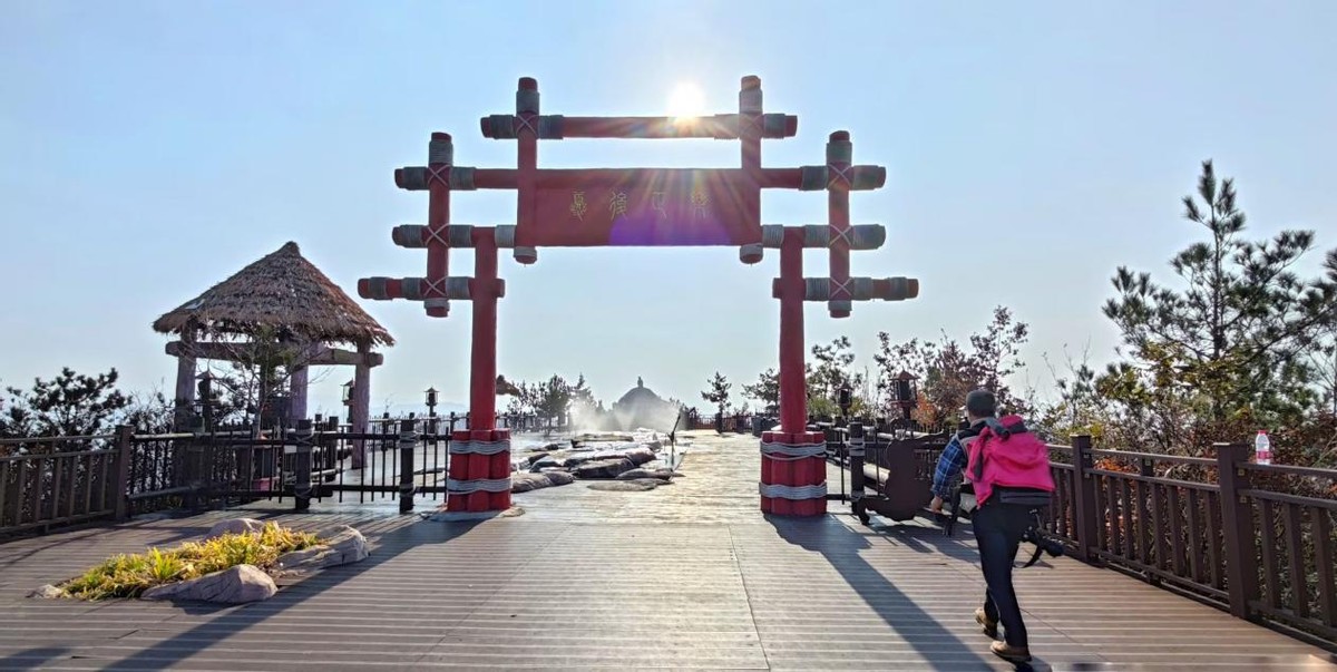 我们也沉醉在这山水之中,玩得不亦乐乎,唯独留下一丝小小的遗憾:未能等到“最美夕阳图”。只因观光车下午6点是最后一班下山车次,为了赶在天黑前踏上返程,只得恋恋不舍地告别山顶。好在折返景区出口的途中,偶遇几簇红叶在山间枝头摇曳,与阳光嬉戏互动,那抹耀眼的红在苍松翠柏间格外抢眼,算是为这份遗憾添了一抹亮色。