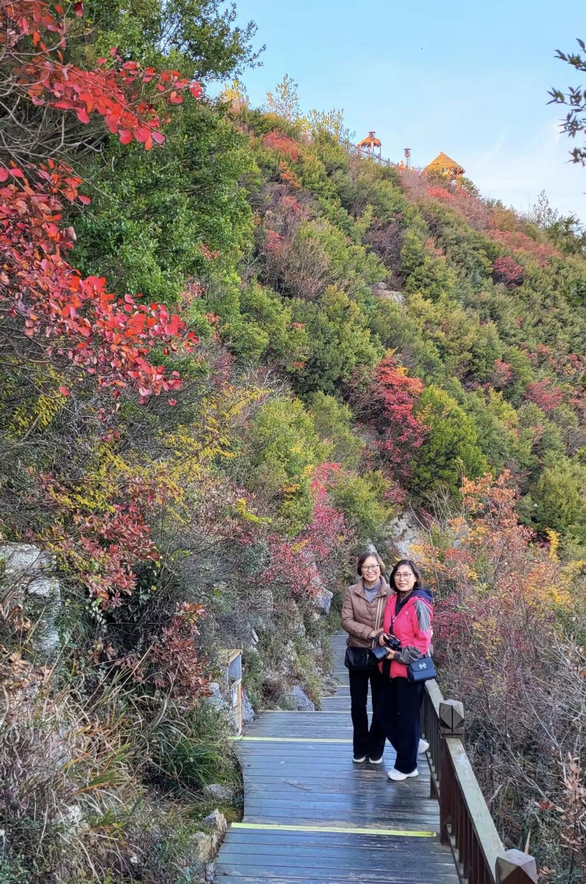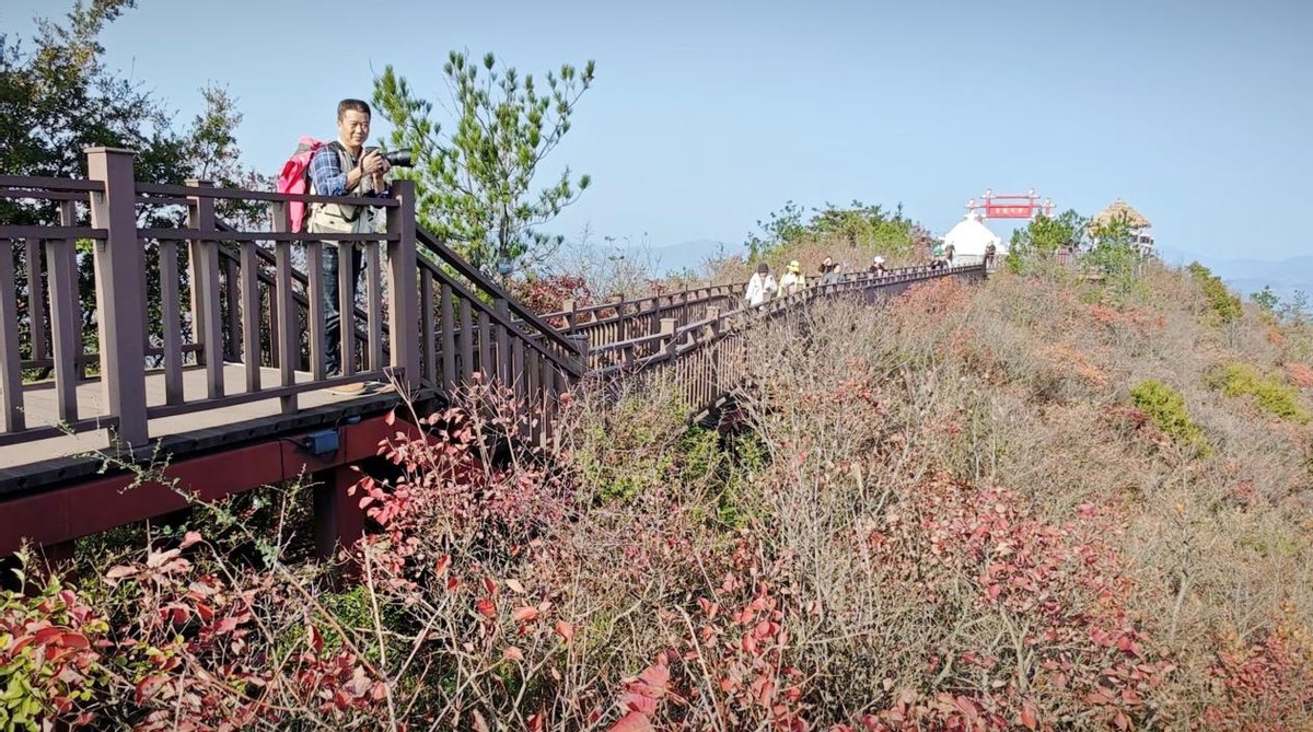 进入景区,我们沿步道拾级而上,在蜿蜒起伏的山脊上前行。真不凑巧,山顶的红叶开始凋落,我们错过了满山红叶似彩霞的时节。