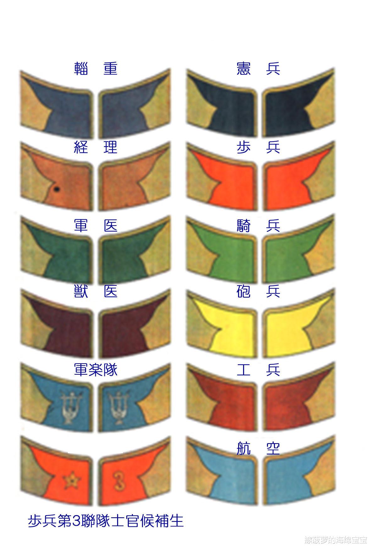 领章样式为锹形。步兵、骑兵、炮兵、工兵、辎重和航空兵领章上有数字单位编号(团或营)。台湾歩兵联队中队的左领章为樱花,右领章为单位编号。朝鲜步兵联队的左领章为联队编号,右边为樱花和中队编号。独立守备大队的左领章为大队编号,右领章为特殊徽章。属于各兵种(野战炮兵、山炮兵、重炮兵、野战重炮兵、高射炮兵)的士兵在领章上佩戴单位徽章。