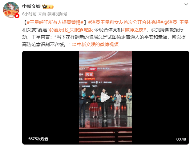 今晚微博之夜红毯与内场全程刷屏,演员王星和女友嘉嘉首次公开合体亮相,瞬间冲上热搜前排。不同于其他艺人聊作品、谈造型,两人现场直面跨国救援经历,王星一番反诈发言真诚又戳心,台下观众与线上网友都被狠狠共情。