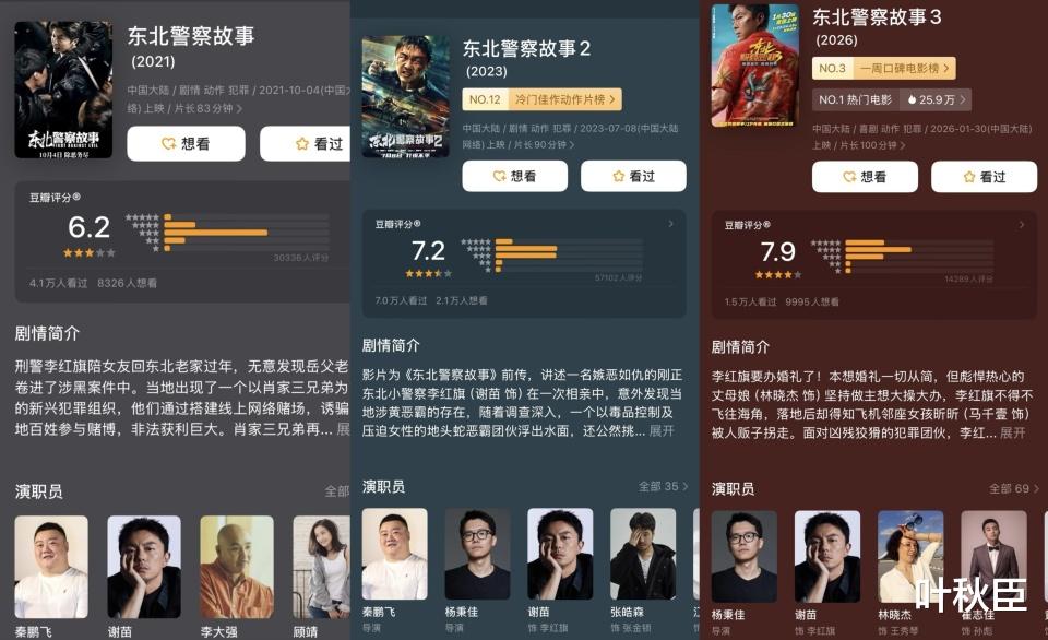 《东北警察故事》IP源于2021年,第一部由秦鹏飞执导,杨秉佳编剧,谢苗主演。第二部的时间线为第一部前传,秦鹏飞和杨秉佳联合执导,依旧是杨秉佳编剧,继续以谢苗饰演的李红旗为核心主角来展开故事,都是网络大电影。