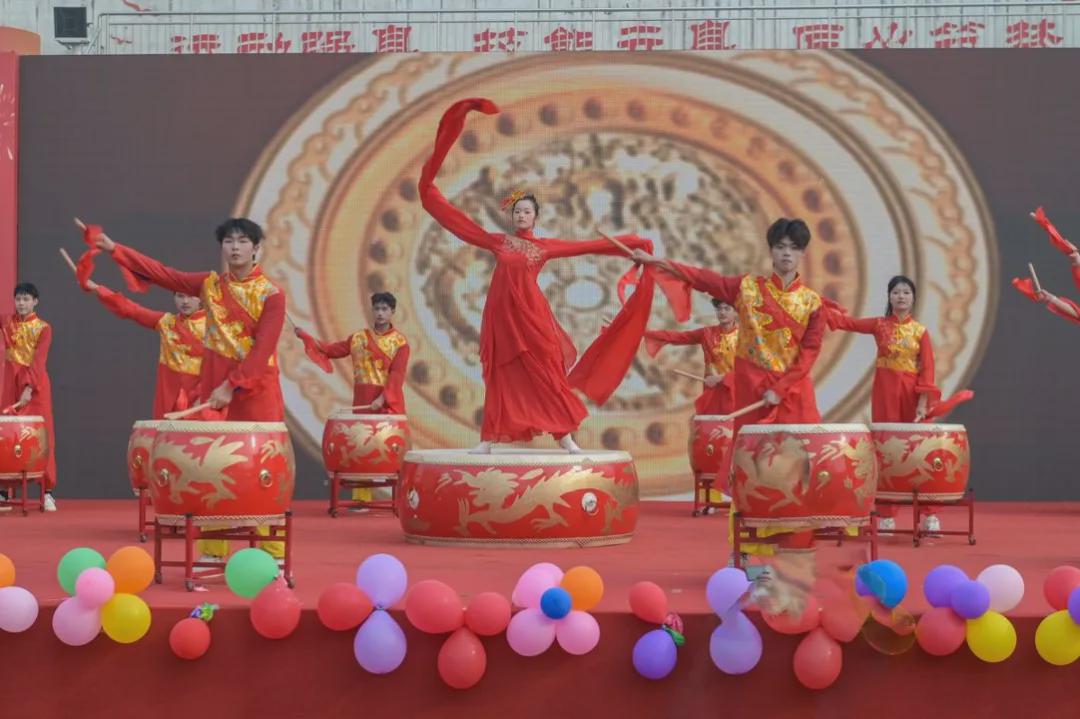 在激昂的鼓点中,国旗队带来开场舞蹈《匠鼓雷鸣》,以震撼的节奏敲响了职教人奋进的时代强音。
