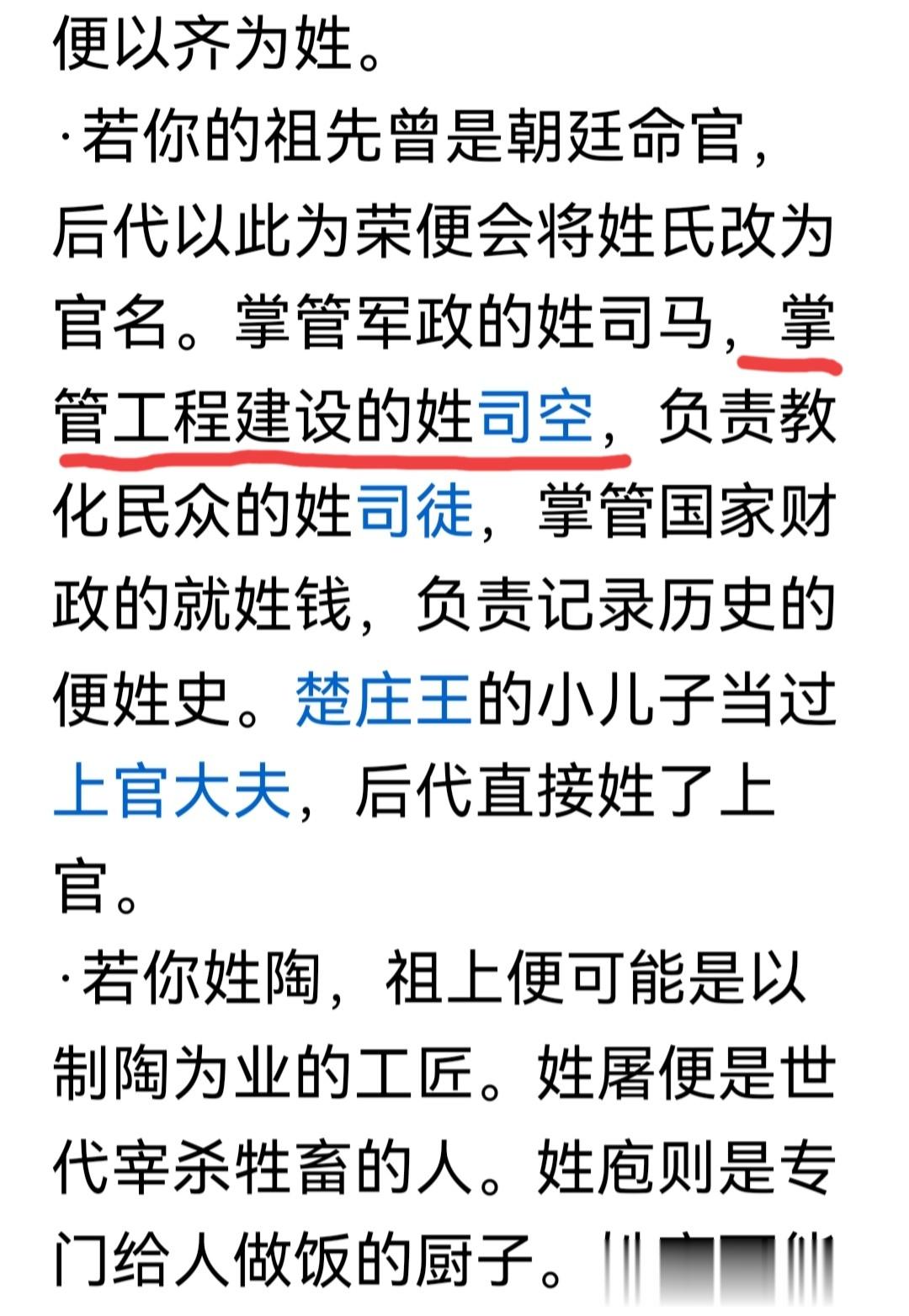 其中,“掌管军政的姓司马,掌管工程建设的姓司空,负责教化民众的姓司徒”。