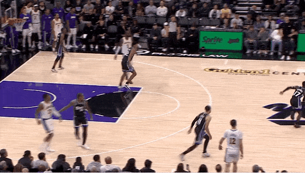 NBA常规赛,国王主场迎战湖人的比赛正在进行中。比赛的第二节,施罗德中圈抢断,助飞拉文完成空接单手劈扣。