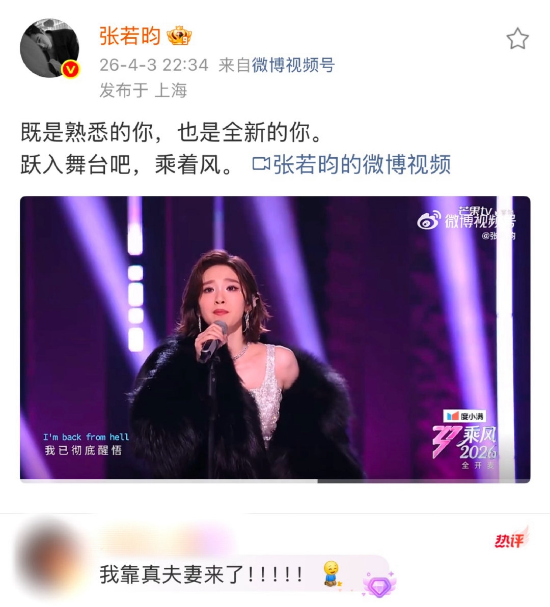 娱乐圈的聚光灯下,明星夫妻的互动往往容易沦为公关稿的堆砌,但张若昀与唐艺昕却总能在不经意间,用一种名为“日常”的笔触,勾勒出爱情最动人的模样。就在《乘风2026》初舞台直播的当晚,当全网观众的目光都聚焦在姐姐们的唱跳比拼时,张若昀的一条微博悄然上线,没有华丽的辞藻,只有一句深情的“既是熟悉的你,也是全新的你。跃入舞台吧,乘着风!”,瞬间将这份属于“真夫妻”的甜蜜推向了热搜。这不仅是一次简单的宣传,更是一场关于理解与托举的深情告白。