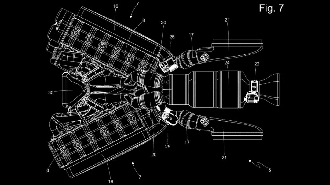 然而,到了第三项专利,法拉利的工程师们脑洞大开了。它展示了两台以V型布局排列的直列六缸发动机。但如果你像看其他V型发动机那样顺着曲轴方向看,它又不是一个V型,只有当你从上方俯视时,这两台发动机才呈V型。它们仅通过一根排气管连接在一起。
