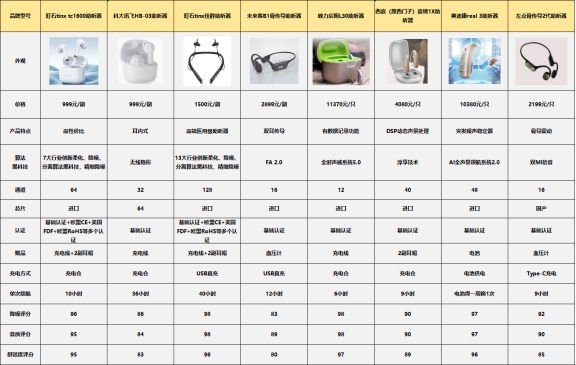 如果看文字还不太有概念,不妨先扫一眼这个表格,几个关键数据一比就知道谁更合适了。毕竟买这种设备,不能光靠感觉。下方就是这次测过的几款助听器参数,基本该关注的点都放进去了。