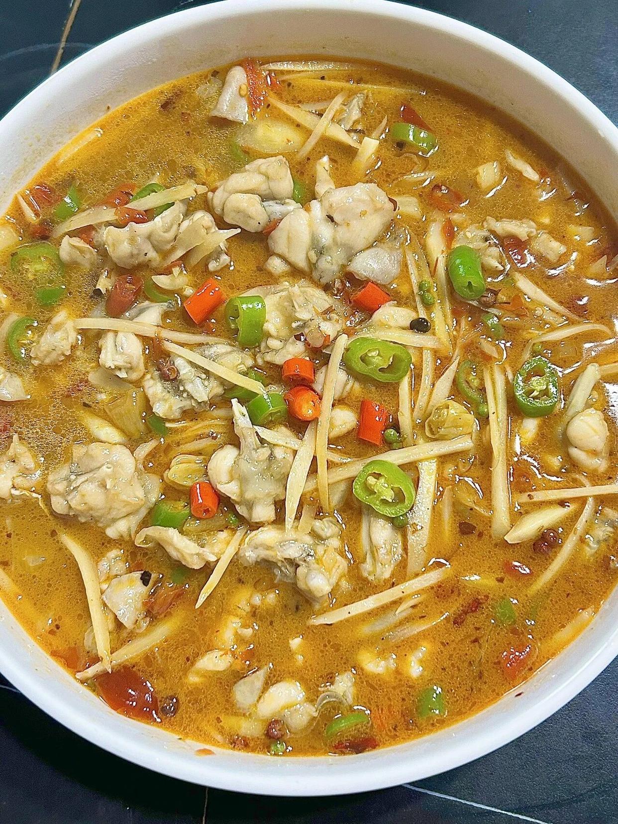 倒入清水,加胡椒粉、盐、两勺生抽煮开,下入牛蛙煮三分钟,再放入仔姜、青红辣椒煮一分钟。