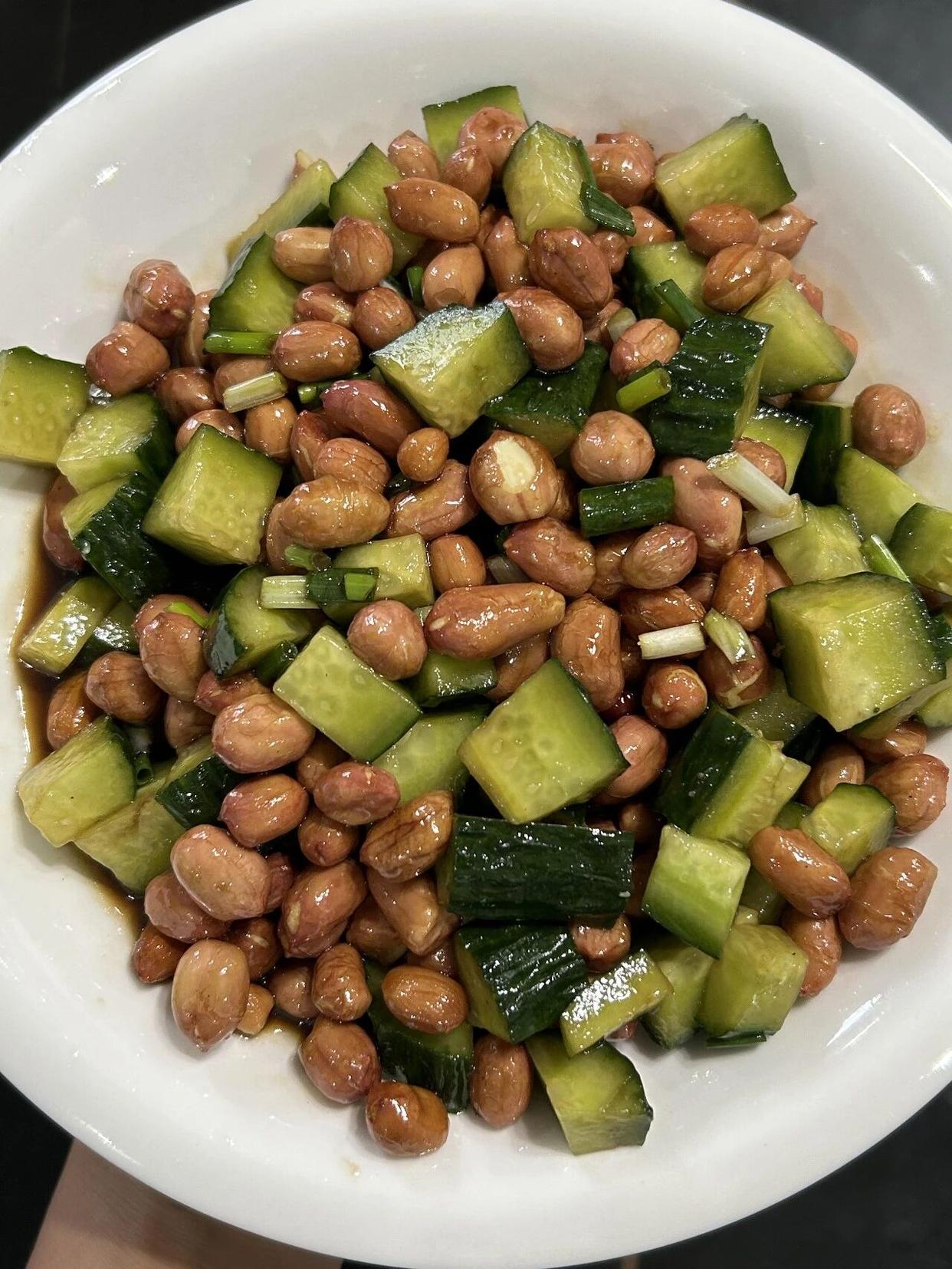 将酱汁淋在黄瓜丁和花生米上,撒上葱花拌匀。