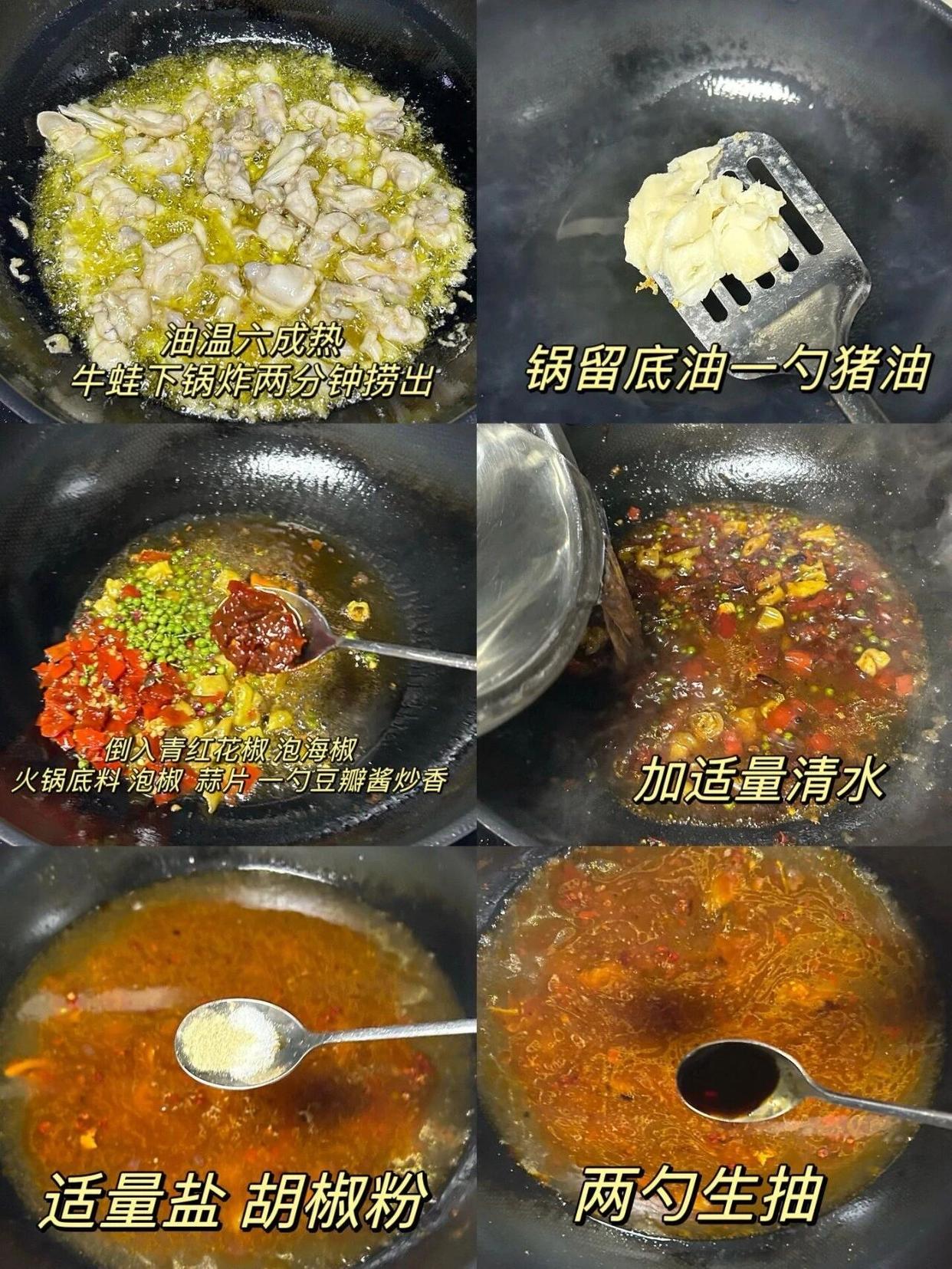 油热后放入牛蛙炸两分钟捞出,锅留底油,加入一勺猪油、泡海椒、小米辣、蒜片、火锅底料、青红花椒、一勺豆瓣酱炒出红油。