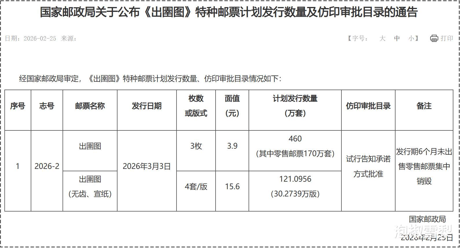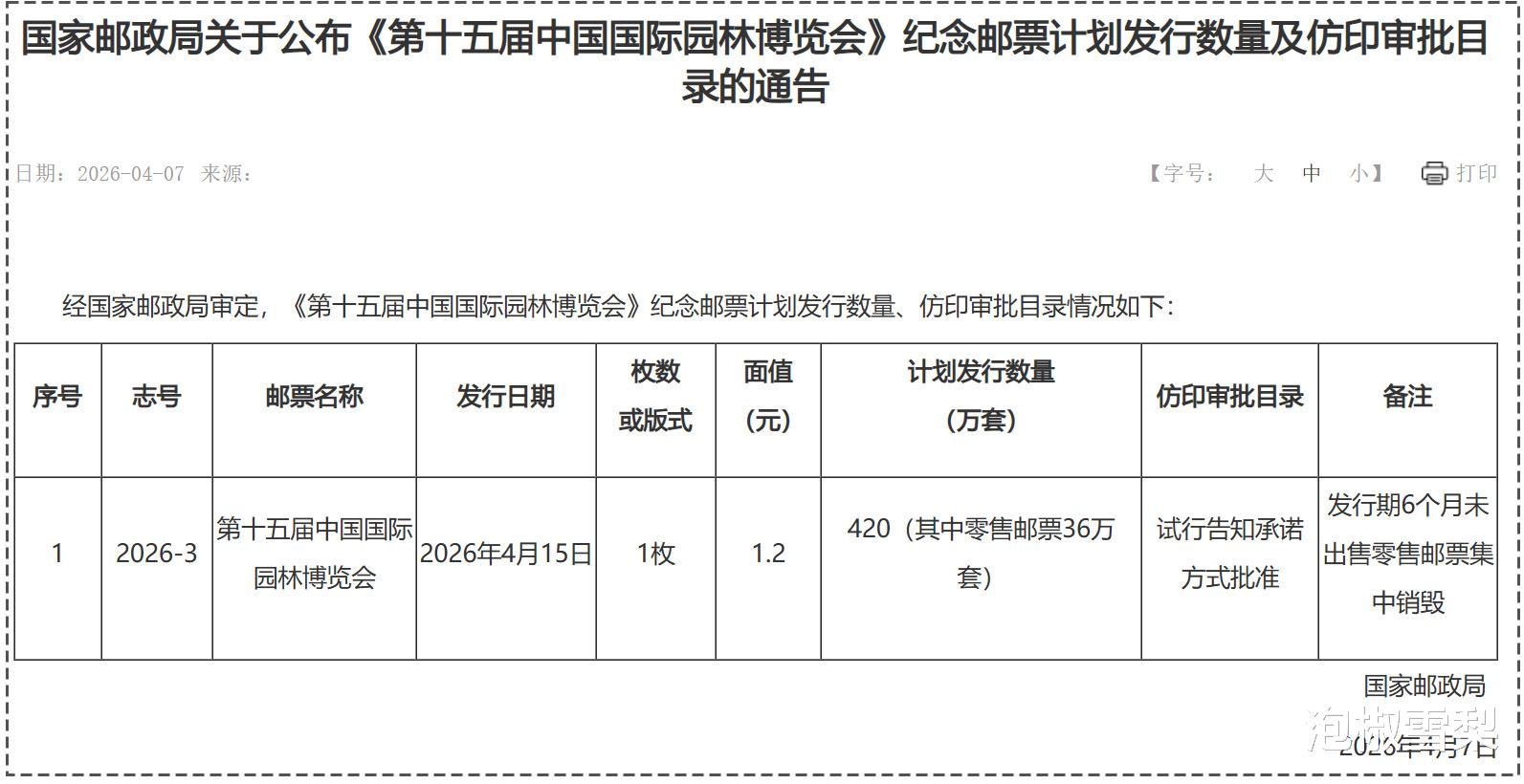 2026年4月7日,国家邮政局公布了今年第三套邮票《第十五届中国国际园林博览会》邮票计划发行量,共计420万套,比2025年黑马邮票“中国农业大学”还要少30万套。