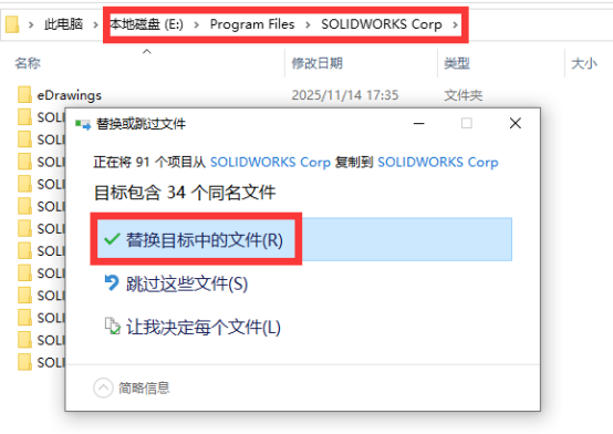 24、找到前面安装的时候更改的位置,在空白区域鼠标右键,选择【粘贴】,再点击【替换目标中的文件】。