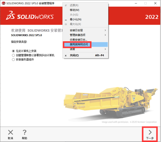 13、在上方空白区域鼠标右键,点击【禁用因特尔网访问】,然后点击【下一步】。