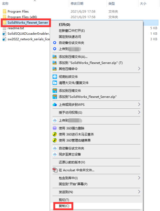 6、继续找到【SolidWorks_Flexnet_Server】文件夹,鼠标右键,选择【复制】。