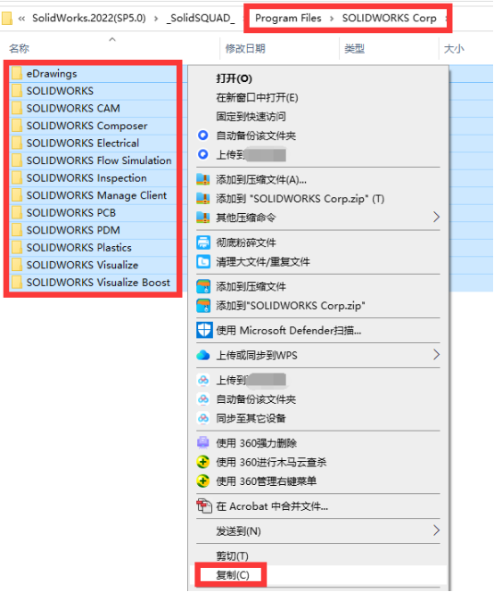 23、继续点击【SOLIDWORKS Corp】文件夹,通过Ctrl+A全选里面的文件,鼠标右键,选择【复制】。