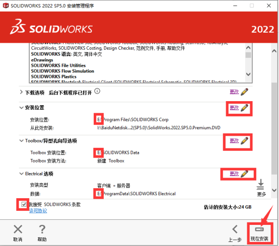 15、点击【安装位置】、【Toolbox/异型孔向导选项】、【Electrical选项】右边的【更改】按钮,将默认的C盘改成别的盘,并且记住这个地址,勾选【我接受】,然后点击【现在安装】。