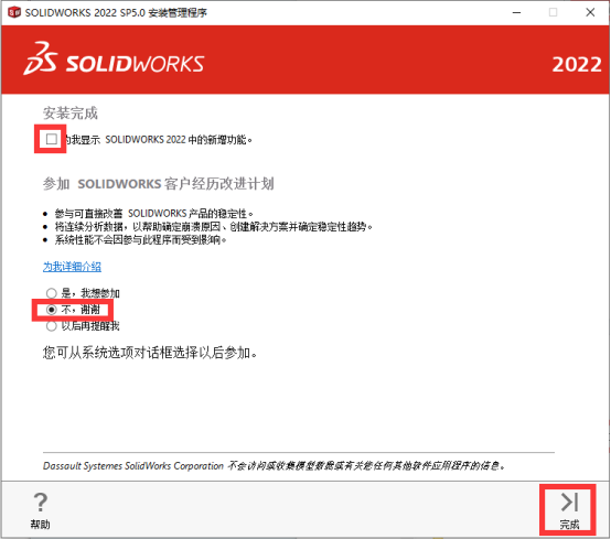 18、显示安装完成,把【为我显示】前面的√取消掉,然后点击底下的【不】,再点击【完成】。