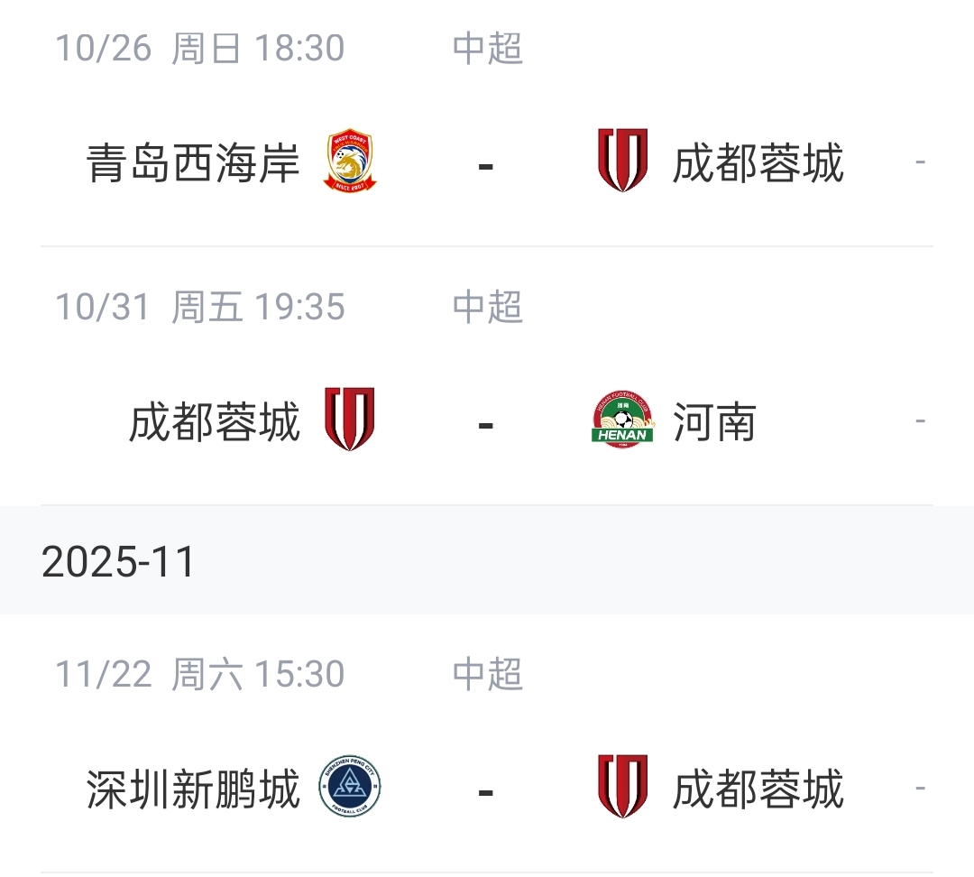 成都蓉城,最后三轮比赛,分别是客场对阵青岛西海岸,主场对阵河南,以及客场对阵深圳新鹏城。三个对手中,只有深圳新鹏城是保级队伍,其余两支球队属于无欲无求!