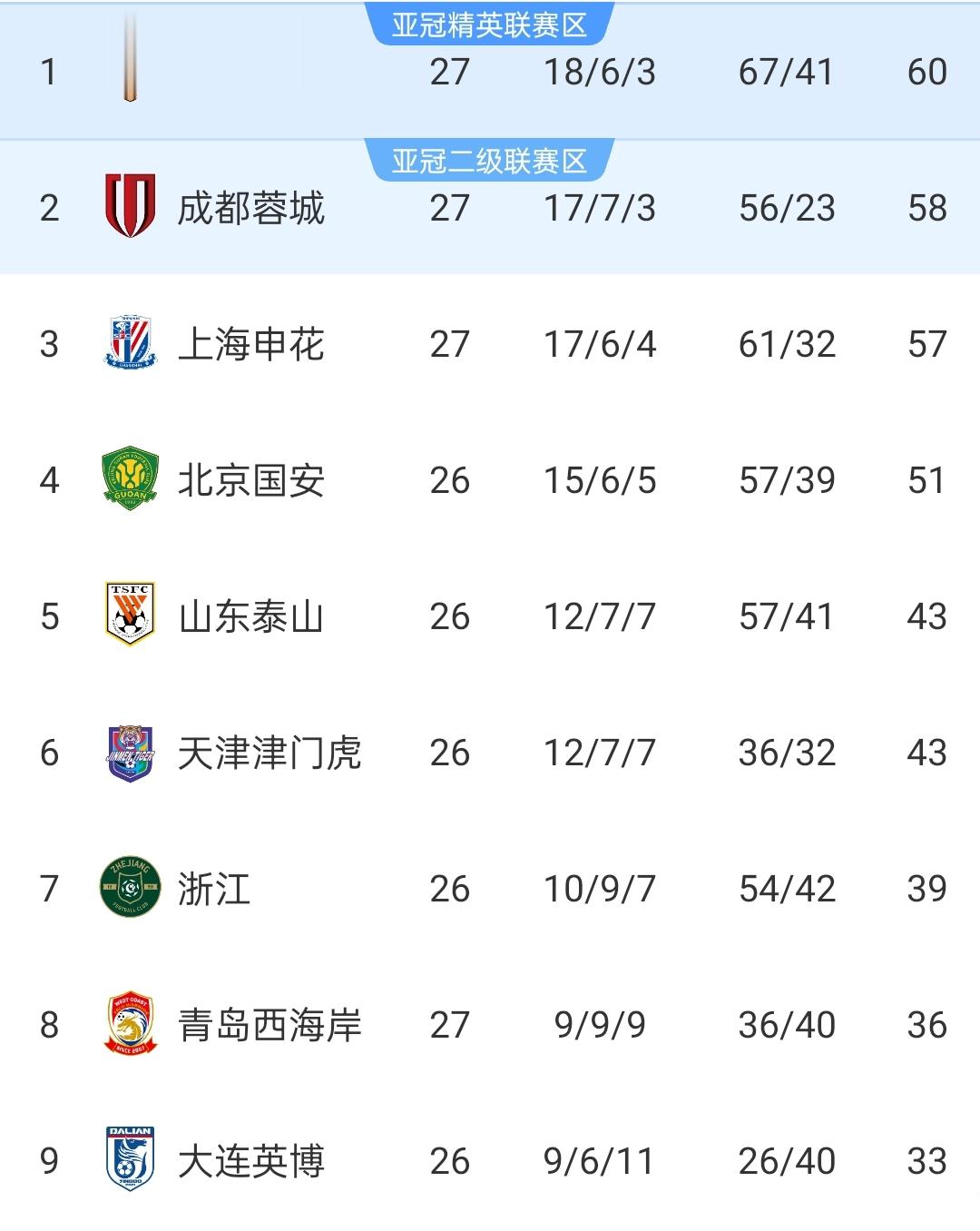 积分榜上,由于前三名都取得胜利,排名没有任何变化,上海海港继续以2分的优势,领跑积分榜,成都蓉城、上海申花分列二三位。