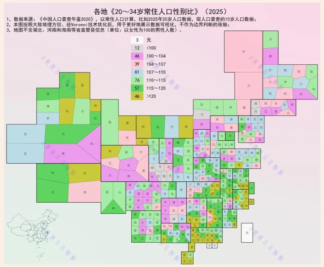 地图清晰显示,多个省级行政区的这一比例超过了120。这意味着,在这些区域,每100位20至34岁的女性,对应着超过120位同年龄段男性。