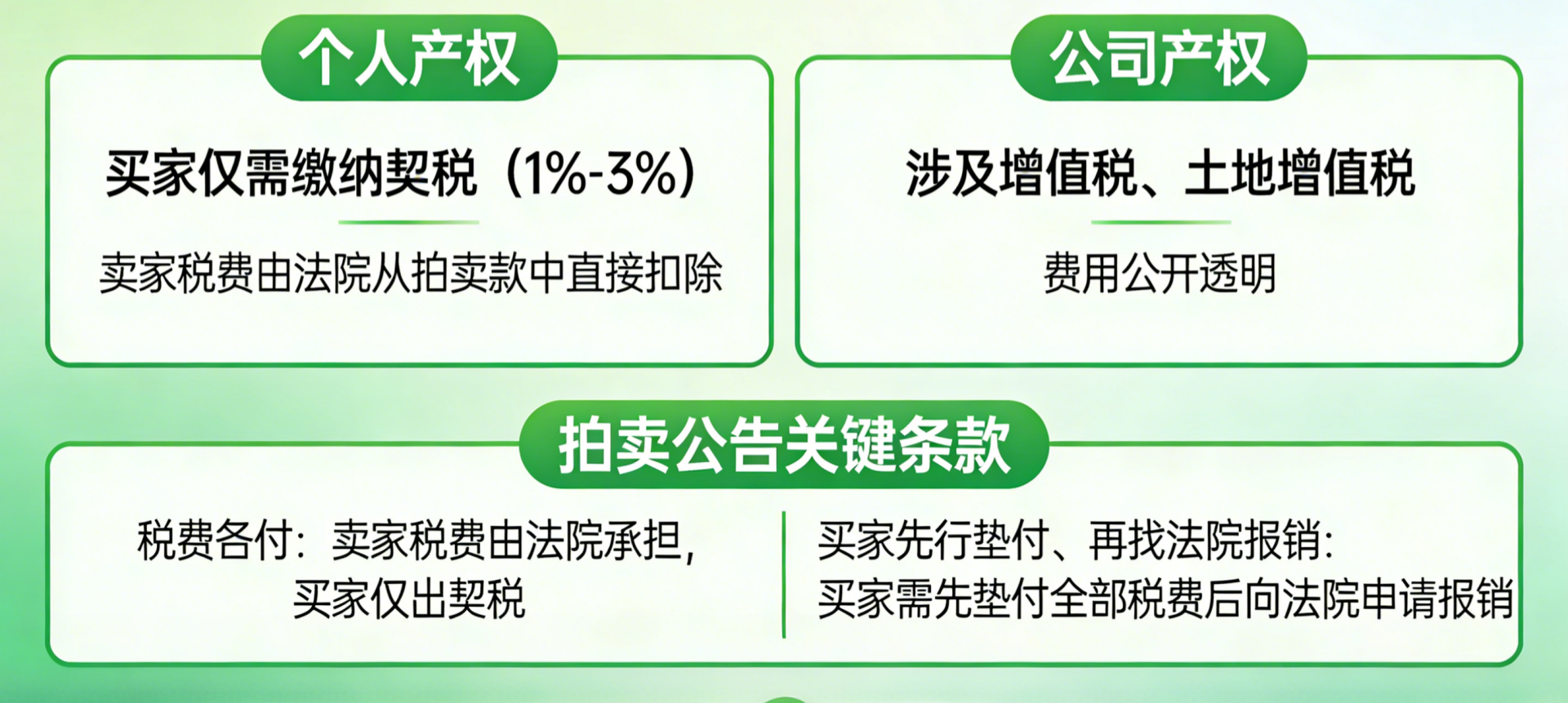 关键在于拍卖公告里的两句话:如果是“税费各付”,那卖家的税还是法院承担,你只出契税,和个人产权差不多。如果是“买家先行垫付、再找法院报销”。