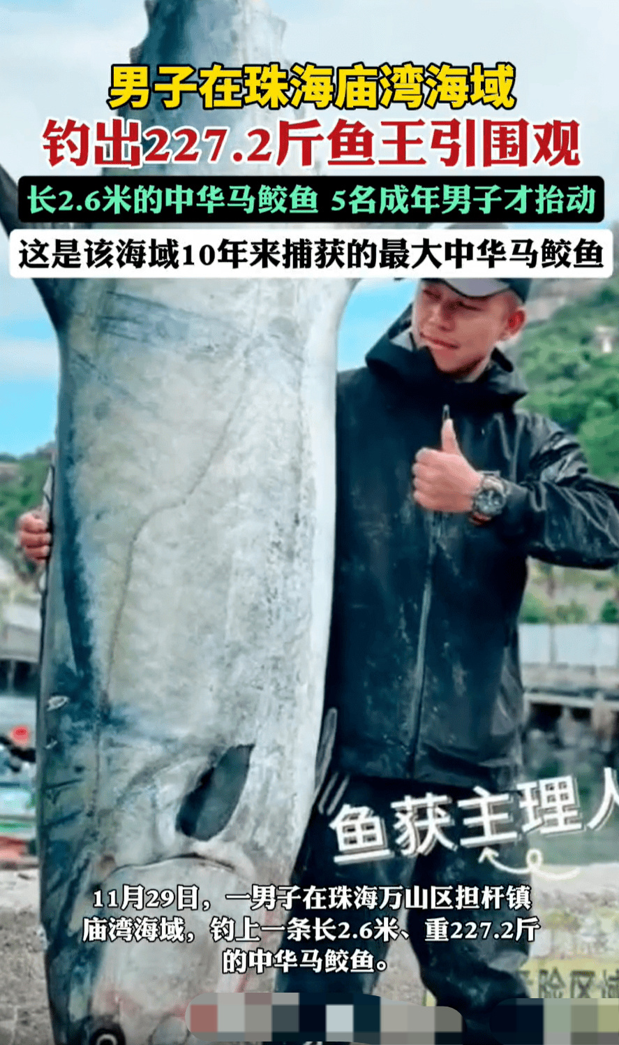 11 月 29 日,珠海万山区担杆镇庙湾海域上演现实版 “捕鱼传奇”—— 一名钓友钓起一条体长 2.6 米、重达 227.2 斤的中华马鲛鱼,需 5 名成年男子借助绞盘合力抬动,刷新该海域近十年捕获纪录。鱼身银鳞闪烁,尾鳍展开如蒲扇,现场游客与渔民争相拍照,视频画面中鱼竿被拉成满弓的紧张瞬间,成为社交媒体热议焦点。