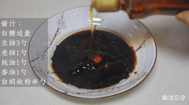 酱汁:白糖适量、生抽3勺、老抽1勺、蚝油1勺、香油1勺、白胡椒粉半勺
