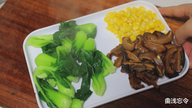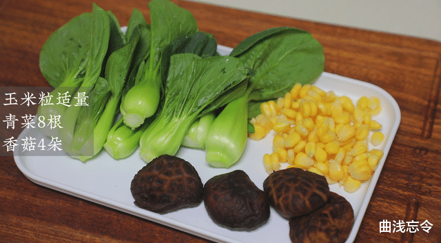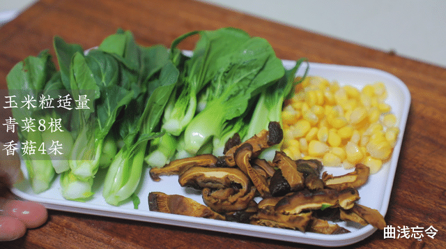 4、处理食材(素):青菜洗净切开,干香菇提前泡发(冷水4~6小时,温热水30~60分钟),泡好的香菇切片,用油盐水煮开后分别把青菜、香菇、玉米粒焯水1~3分钟焯熟。
